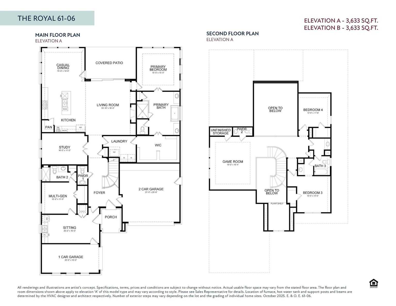 The Royal floor plan showcases 3,633 sq. ft. of flexible living space with four bedrooms, three-and-a-half baths, and both a two-car and single-car garage. The main floor offers an open-concept kitchen, casual dining, and living room that extend effortlessly to the covered patio. A private primary suite with a spa-style bath and oversized walk-in closet creates a serene retreat, while the multi-gen suite with sitting area and full bath provides privacy for extended family or guests. A study, laundry room, and additional storage add everyday convenience. Upstairs, a spacious game room anchors two secondary bedrooms and baths, with open-to-below views enhancing the sense of space. Designed with versatility in mind, the Royal adapts easily to a variety of lifestyles, especially those who love to entertain.