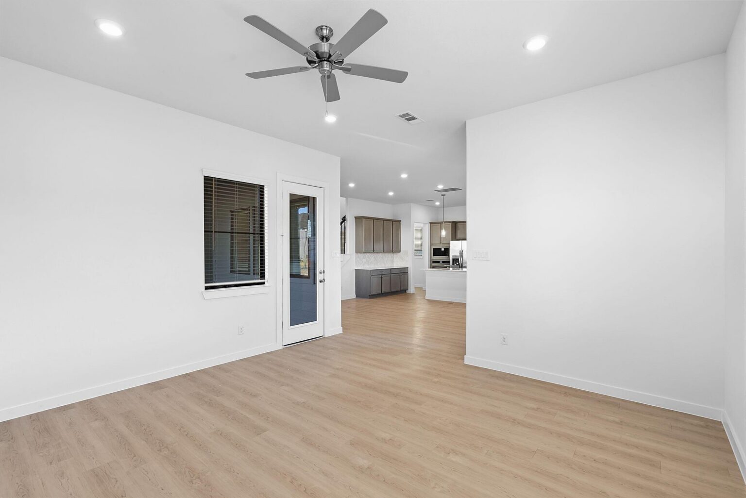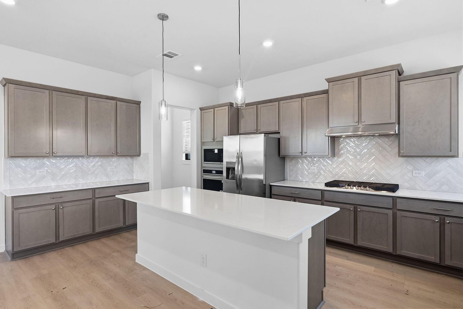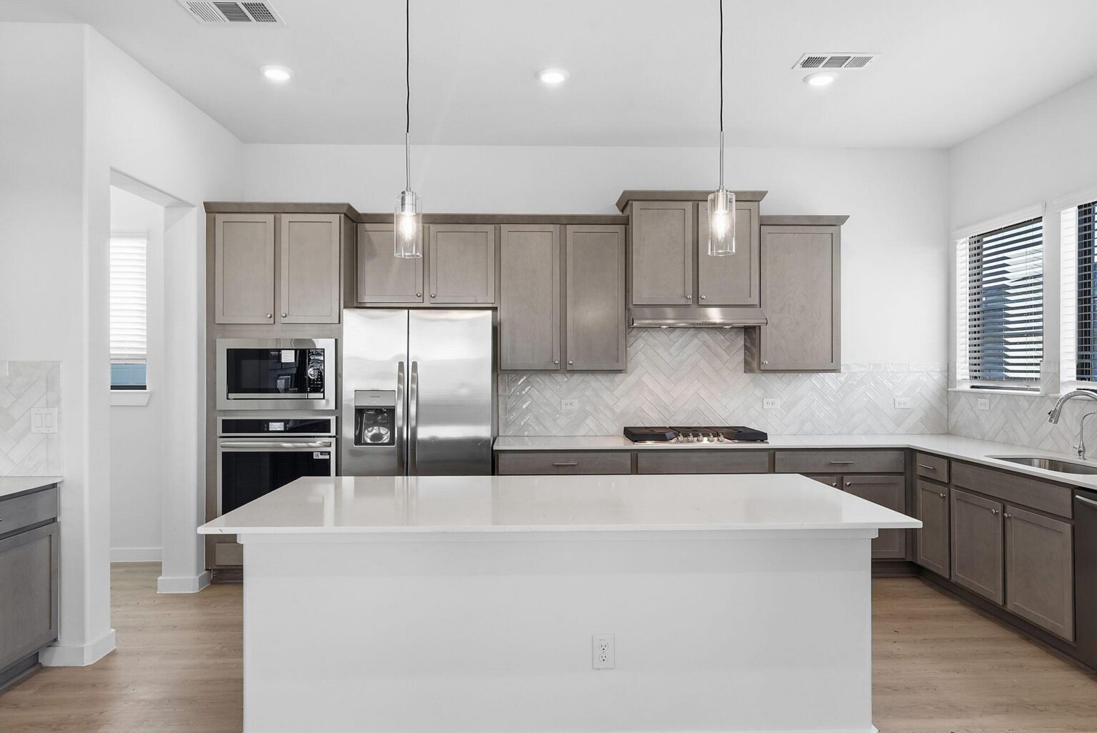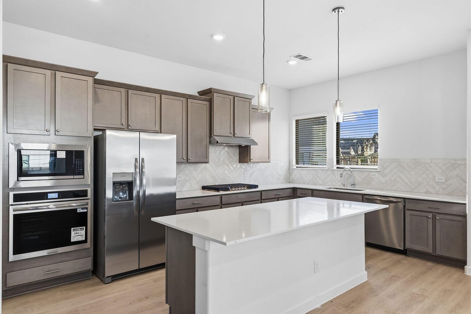 The Ember showcases 2,218 square feet of smart, stylish living with four bedrooms, three full bathrooms, and plenty of flexible space across two stories. The main floor features a spacious open-concept kitchen with an oversized island, walk-in pantry, and casual dining area that flows into a bright living room and a covered patio—perfect for entertaining or relaxing outdoors. A first-floor bedroom and full bath offer a convenient guest suite or home office setup tucked privately away. Upstairs, a central loft connects the remaining three bedrooms, including a luxurious primary suite with a massive walk-in closet and spa-inspired bath. A full-size laundry room and two additional secondary bedrooms with easy access to a shared bath round out the upper level. Elegant finishes like quartz countertops, vinyl plank flooring, LED lighting, and energy-efficient systems are all included, delivering everyday comfort and upscale living in the Indigo Clusters community