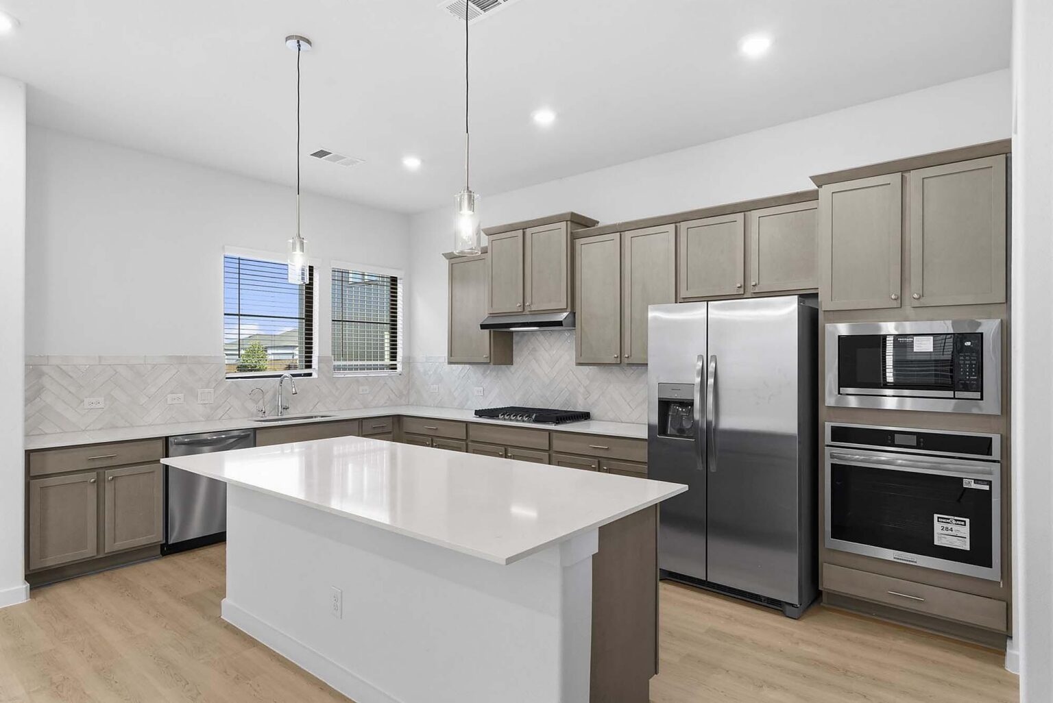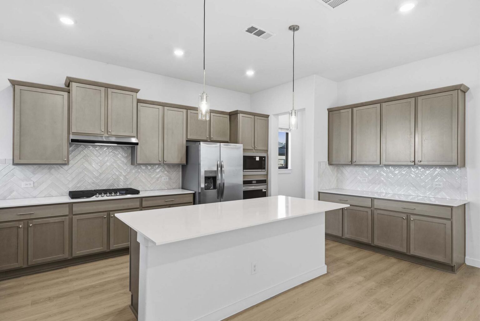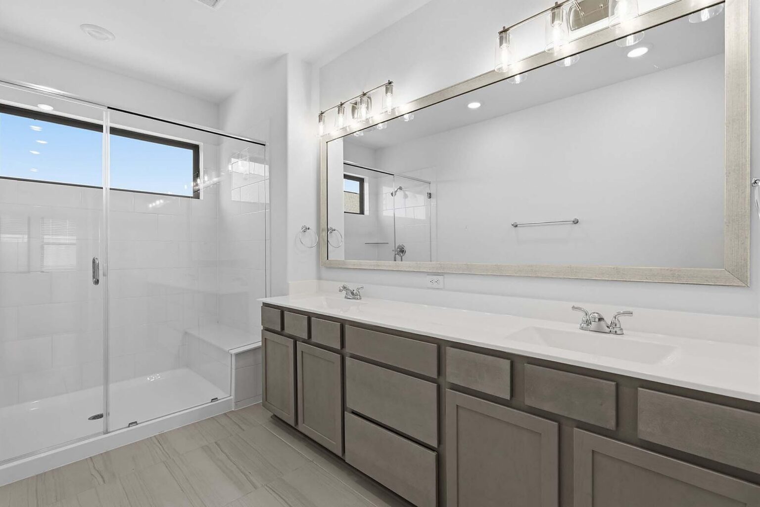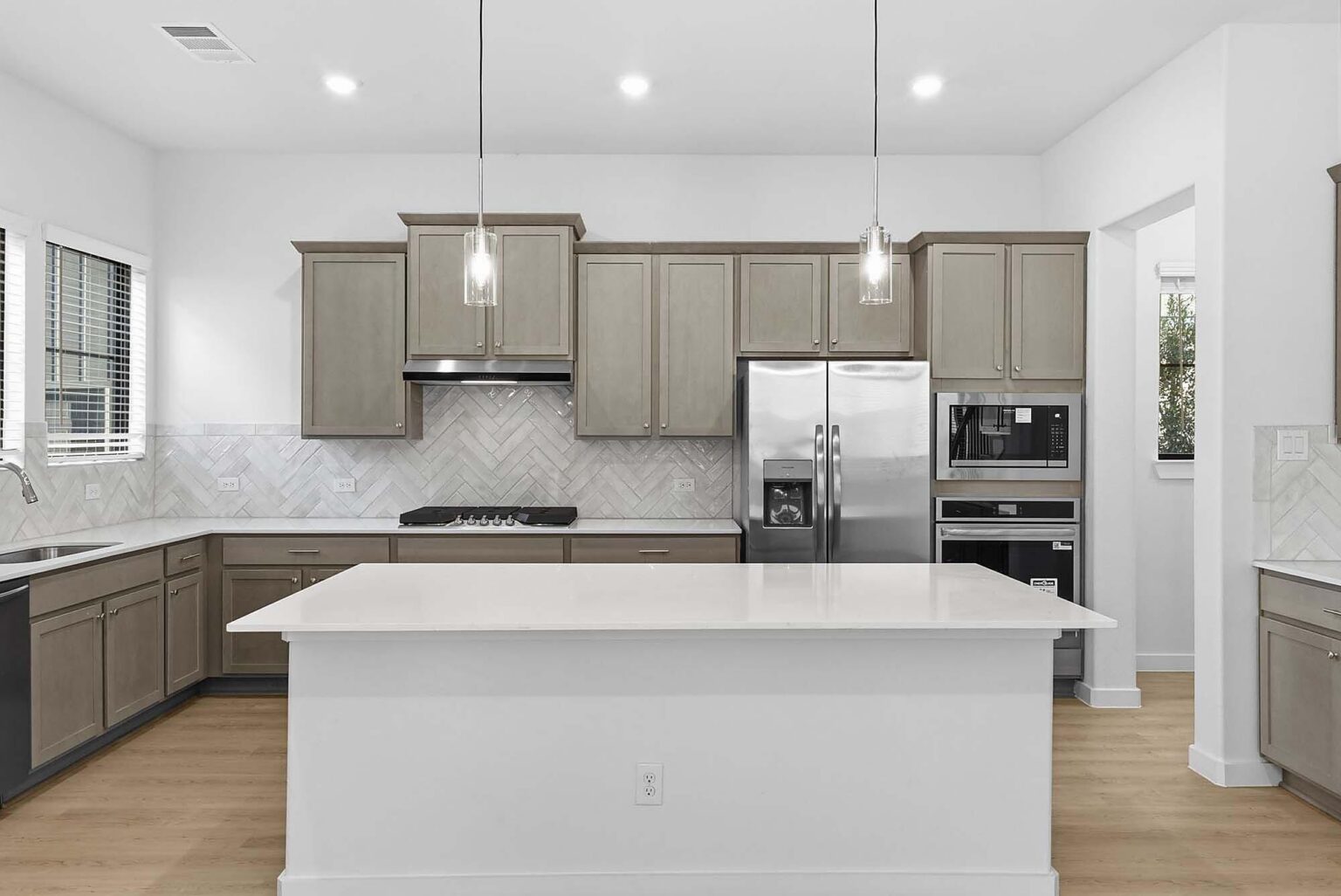 The Ember showcases 2,218 square feet of smart, stylish living with four bedrooms, three full bathrooms, and plenty of flexible space across two stories. The main floor features a spacious open-concept kitchen with an oversized island, walk-in pantry, and casual dining area that flows into a bright living room and a covered patio—perfect for entertaining or relaxing outdoors. A first-floor bedroom and full bath offer a convenient guest suite or home office setup tucked privately away. Upstairs, a central loft connects the remaining three bedrooms, including a luxurious primary suite with a massive walk-in closet and spa-inspired bath. A full-size laundry room and two additional secondary bedrooms with easy access to a shared bath round out the upper level. Elegant finishes like quartz countertops, vinyl plank flooring, LED lighting, and energy-efficient systems are all included, delivering everyday comfort and upscale living in the Indigo Clusters community