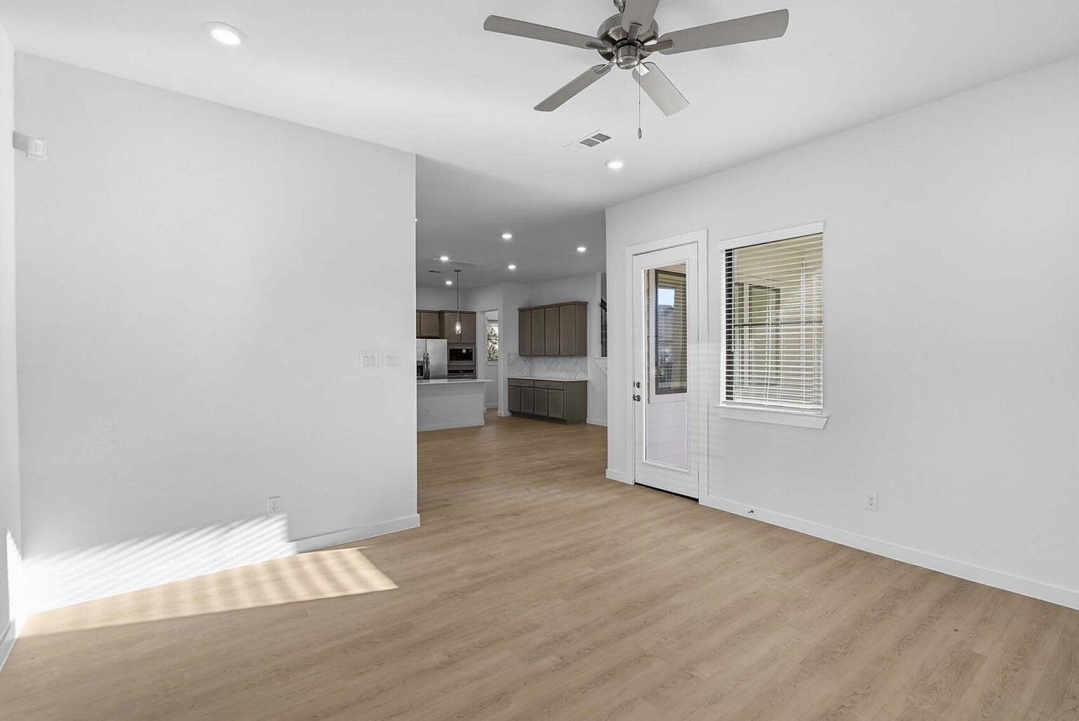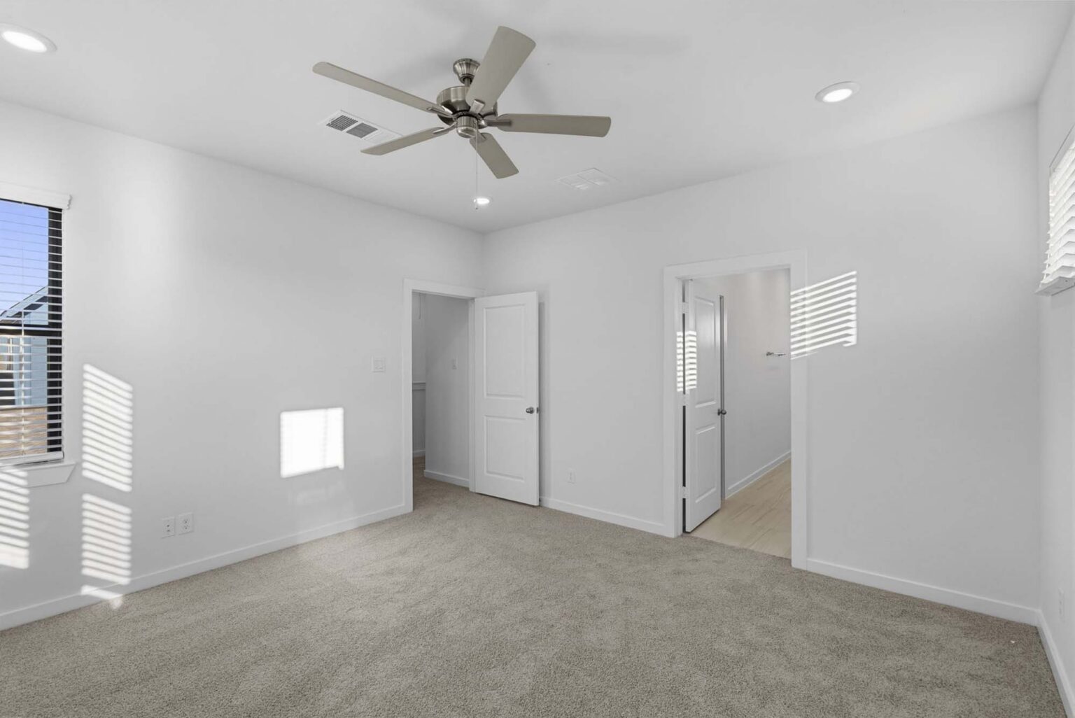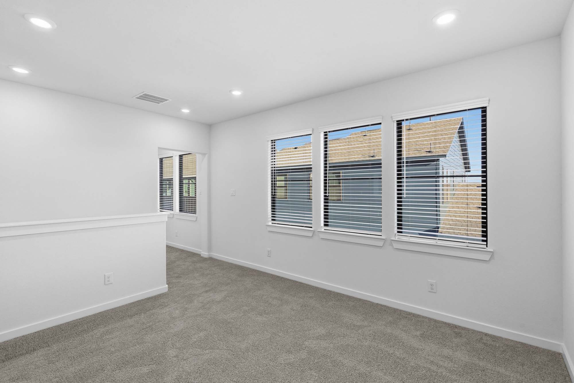 The Ember showcases 2,218 square feet of smart, stylish living with four bedrooms, three full bathrooms, and plenty of flexible space across two stories. The main floor features a spacious open-concept kitchen with an oversized island, walk-in pantry, and casual dining area that flows into a bright living room and a covered patio—perfect for entertaining or relaxing outdoors. A first-floor bedroom and full bath offer a convenient guest suite or home office setup tucked privately away. Upstairs, a central loft connects the remaining three bedrooms, including a luxurious primary suite with a massive walk-in closet and spa-inspired bath. A full-size laundry room and two additional secondary bedrooms with easy access to a shared bath round out the upper level. Elegant finishes like quartz countertops, vinyl plank flooring, LED lighting, and energy-efficient systems are all included, delivering everyday comfort and upscale living in the Indigo Clusters community