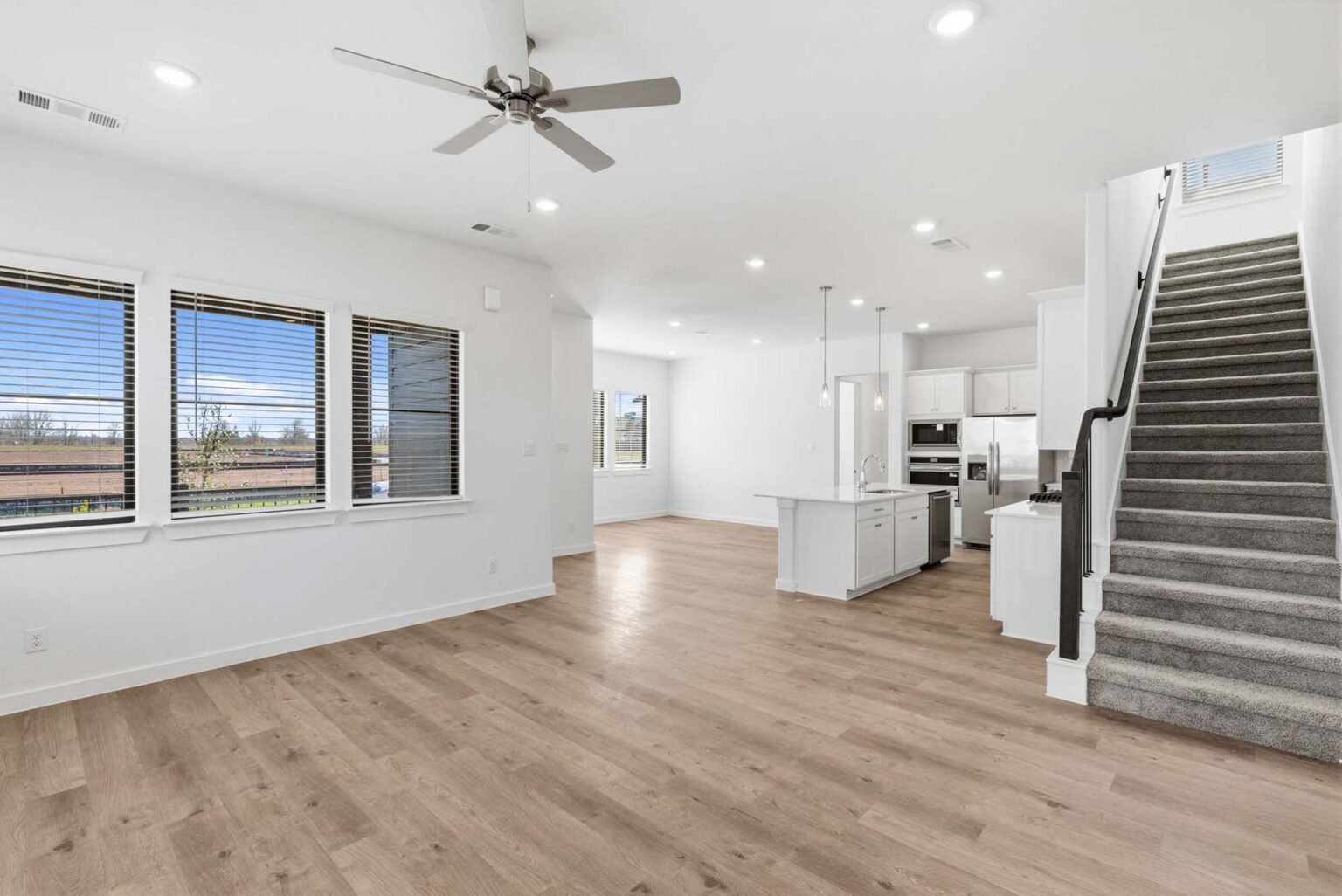 The Heron floorplan blends function and comfort across 1,970 square feet, featuring three bedrooms, three full bathrooms, and an open-concept layout ideal for everyday living. The main floor centers around a spacious kitchen with a central island and overlooks both the dining and living areas, seamlessly connecting to a covered patio perfect for outdoor entertaining. A full bedroom and bathroom on the main level offer flexible living for guests or multi-generational households. Upstairs, a versatile loft and convenient coffee bar sit between the two remaining bedrooms, including a private primary suite with dual walk-in closets and a spa-style bathroom. The design also includes a dedicated laundry room and a two-car garage with smart WiFi-enabled access. Finishes like quartz countertops, luxury vinyl plank flooring, and LED lighting reflect the quality craftsmanship showcased in the Indigo Clusters community.