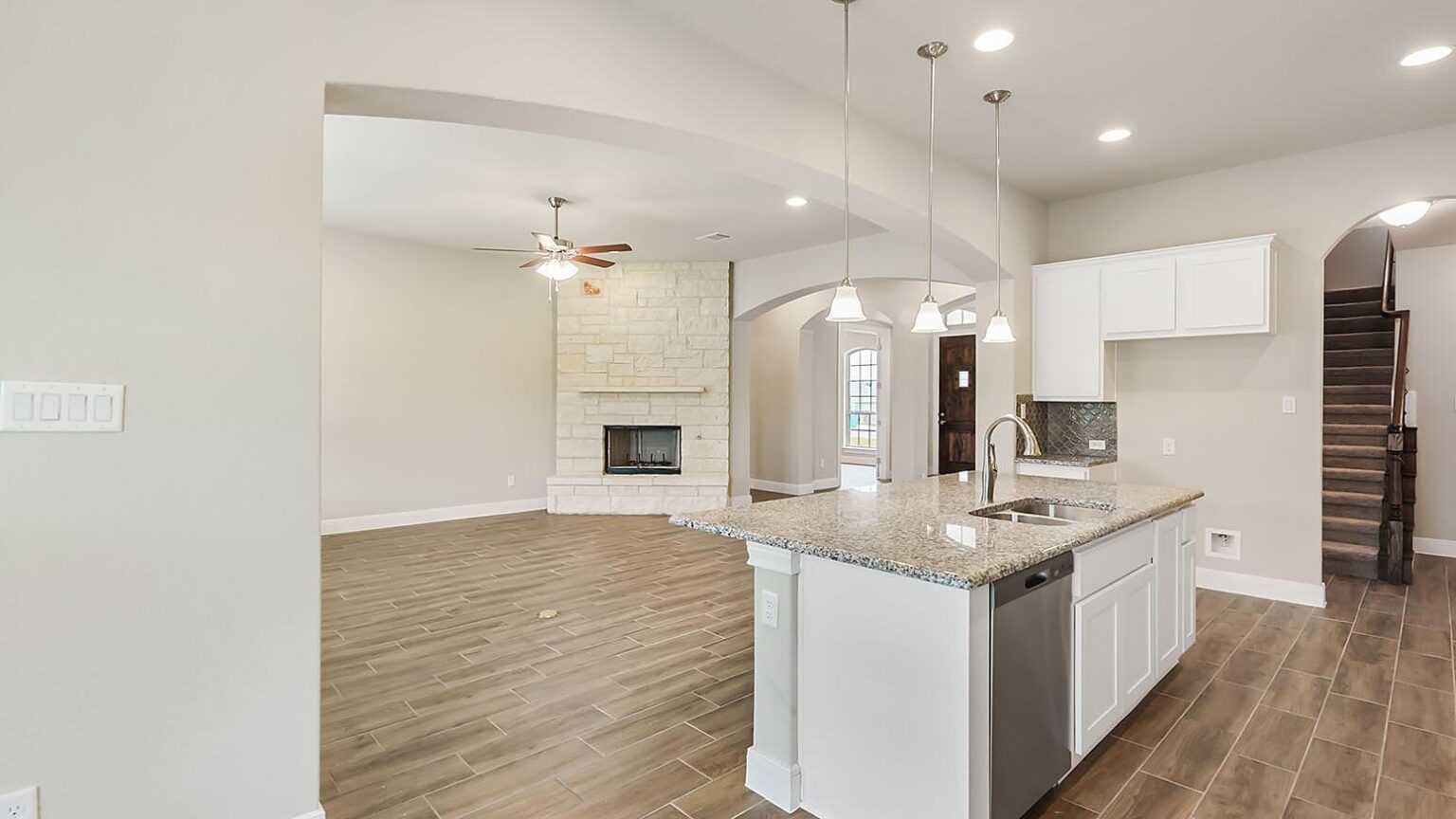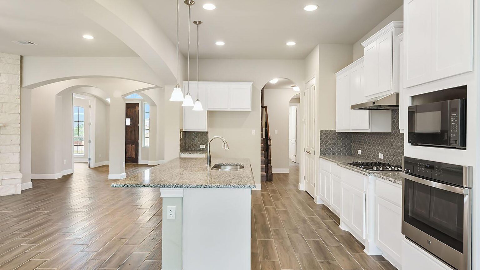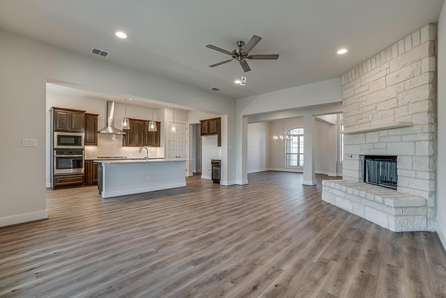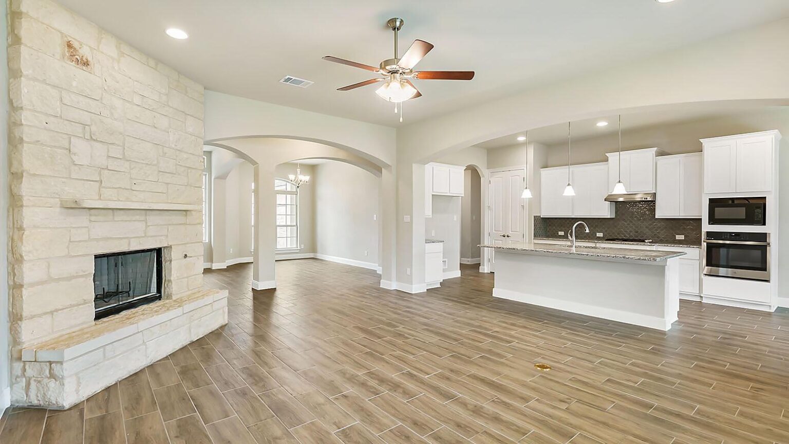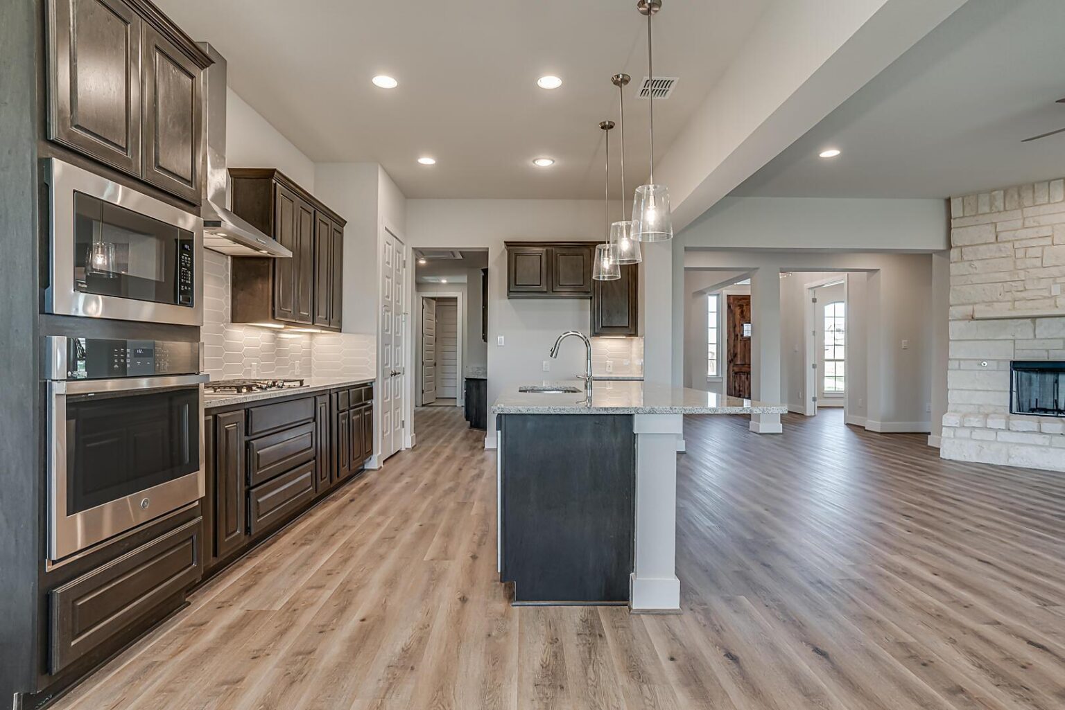 The Calaveras Plan at Everly Estates showcases a refined 2,714 sq. ft. open-concept design perfectly situated on an expansive 1/2 acre homesite. Engineered for peak efficiency, the residence includes a high-performance cooling system, Low E 3 solar reflective windows, and a gas tankless water heater to minimize utility costs. The interior is defined by elegant luxury vinyl plank flooring and a wood-burning fireplace featuring a custom stone surround and mantle. A designer kitchen serves as the heart of the home, boasting J-Kraft custom shaker 42” cabinetry, premium GE® stainless steel appliances, and a specialized Kinetico drinking water system. The exterior is equally impressive, featuring a brick and stone elevation and a professional irrigation system that maintains the native drought-resistant landscaping.