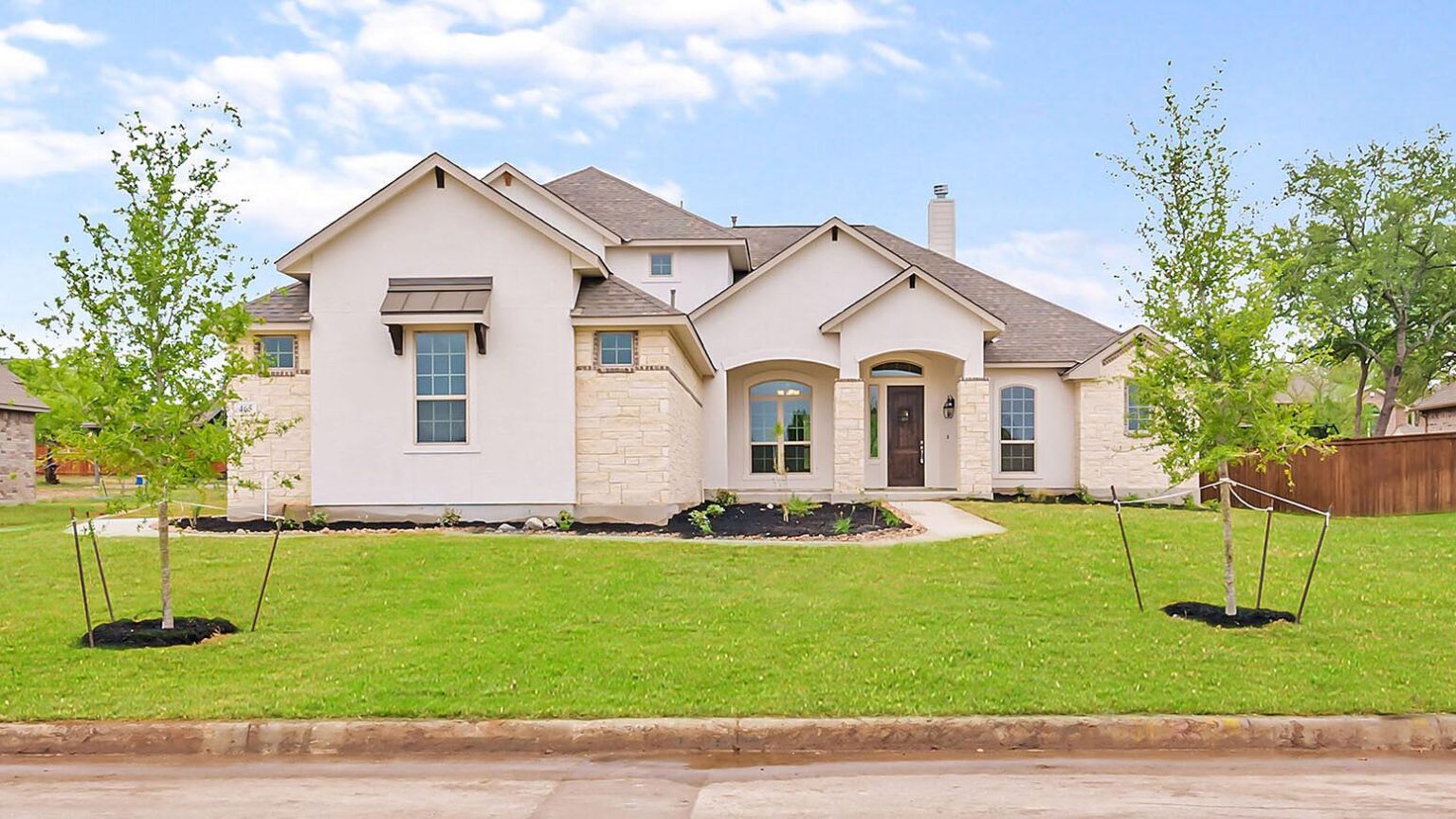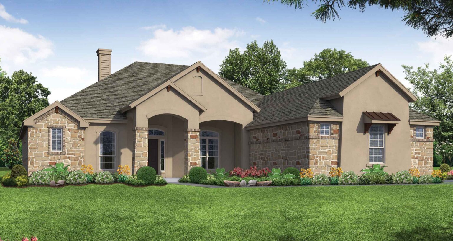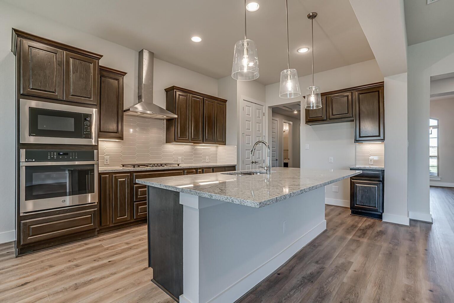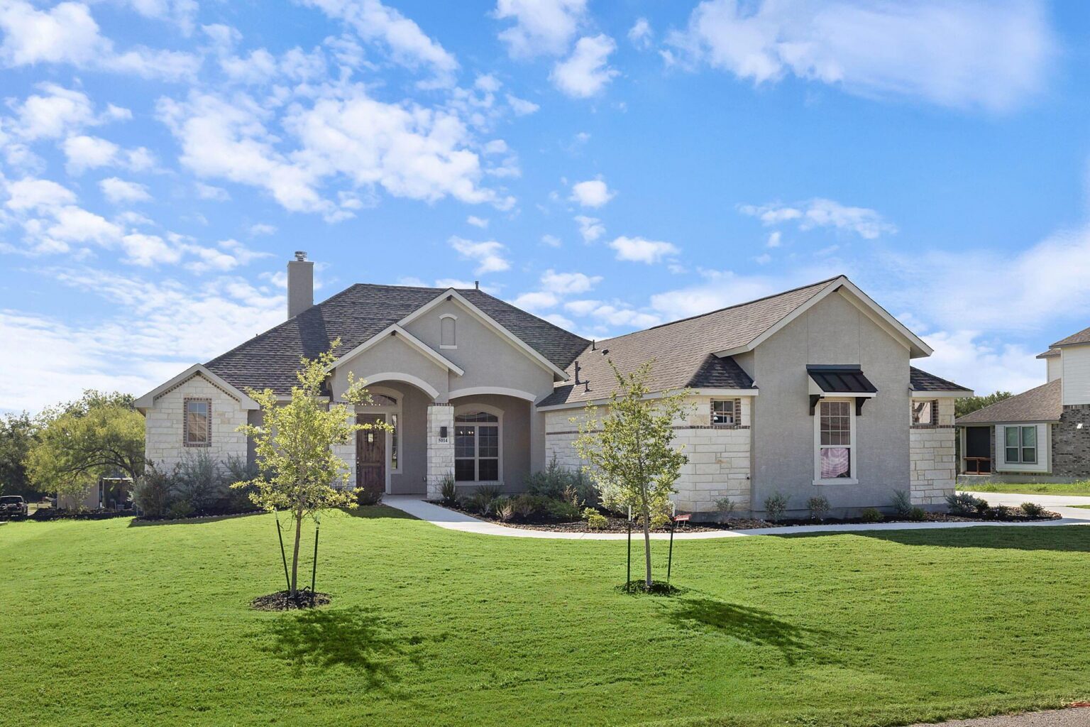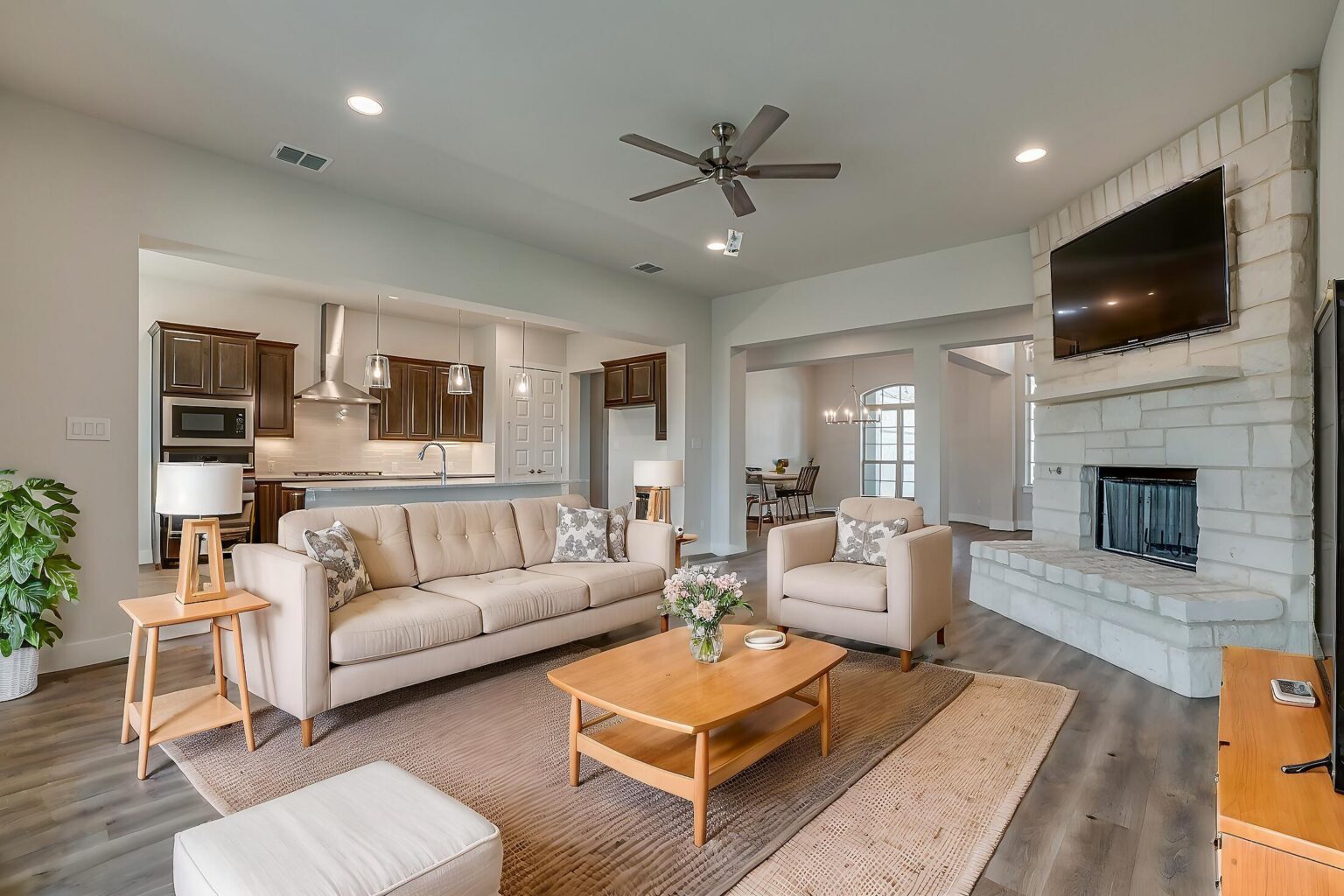 The Calaveras Plan at Everly Estates showcases a refined 2,714 sq. ft. open-concept design perfectly situated on an expansive 1/2 acre homesite. Engineered for peak efficiency, the residence includes a high-performance cooling system, Low E 3 solar reflective windows, and a gas tankless water heater to minimize utility costs. The interior is defined by elegant luxury vinyl plank flooring and a wood-burning fireplace featuring a custom stone surround and mantle. A designer kitchen serves as the heart of the home, boasting J-Kraft custom shaker 42” cabinetry, premium GE® stainless steel appliances, and a specialized Kinetico drinking water system. The exterior is equally impressive, featuring a brick and stone elevation and a professional irrigation system that maintains the native drought-resistant landscaping.