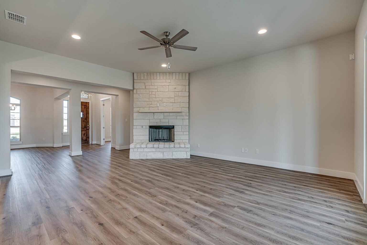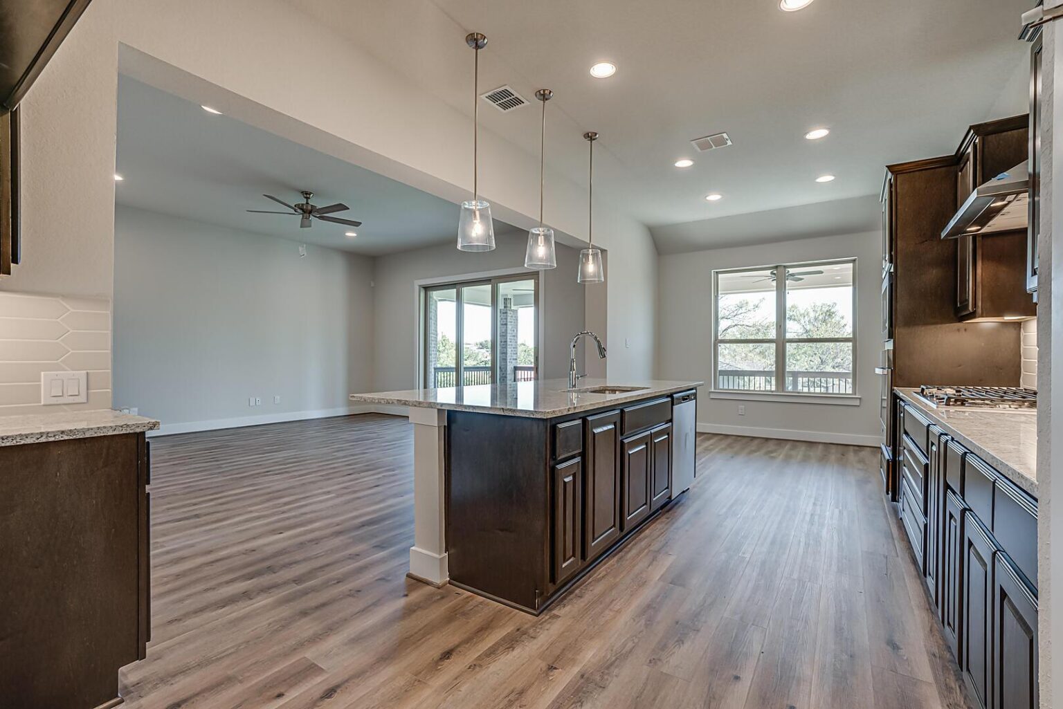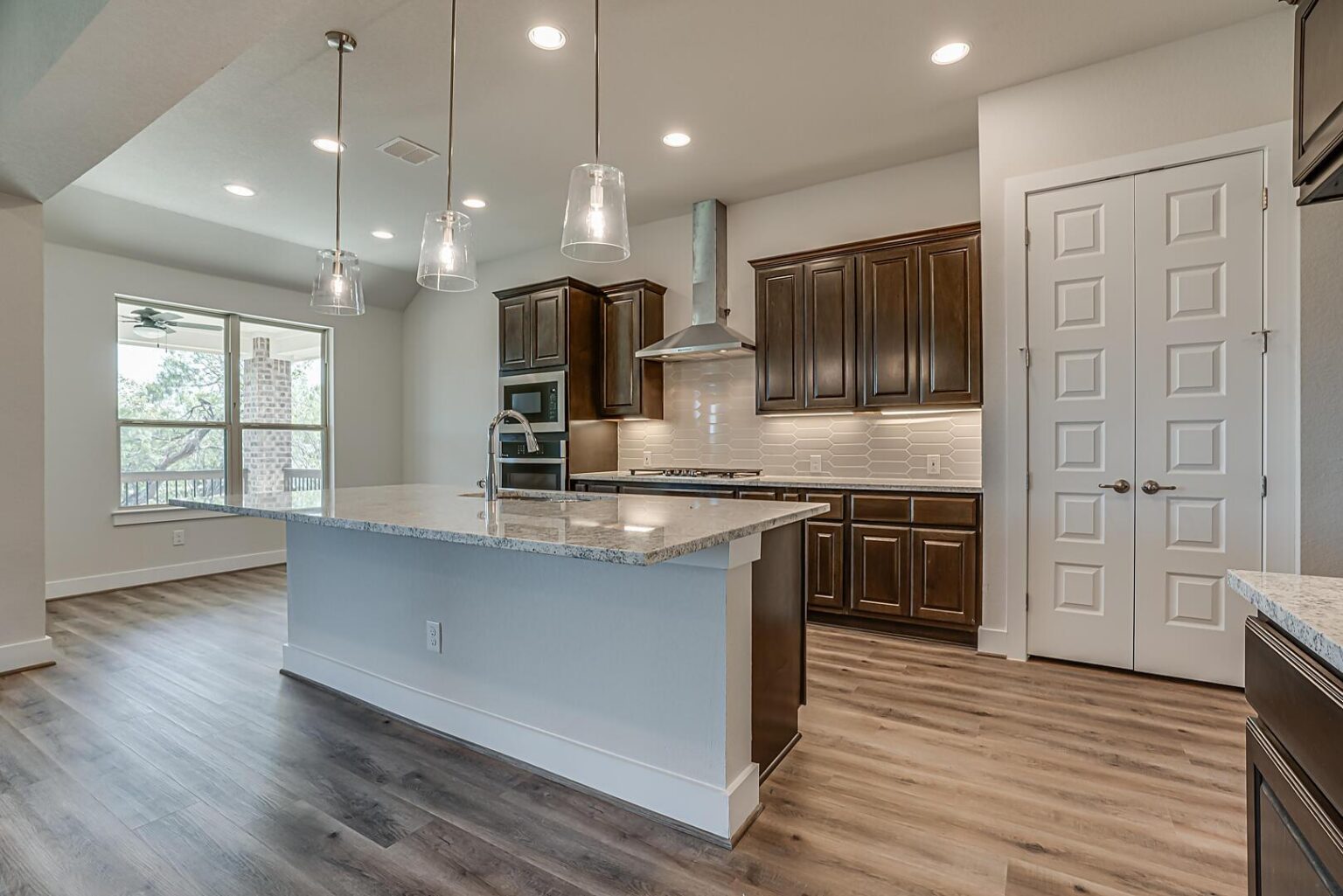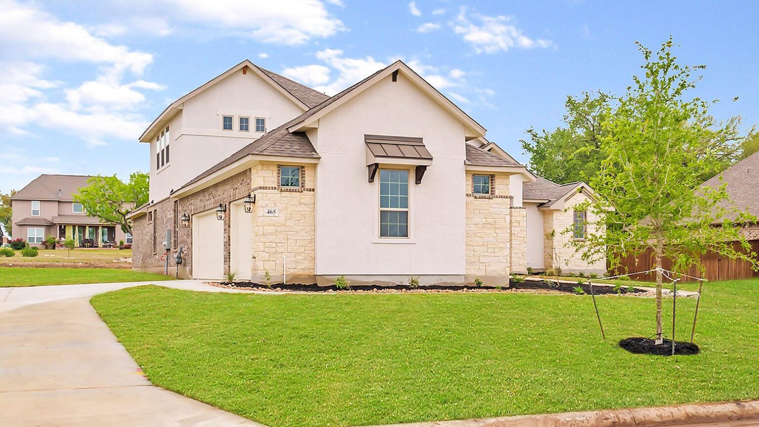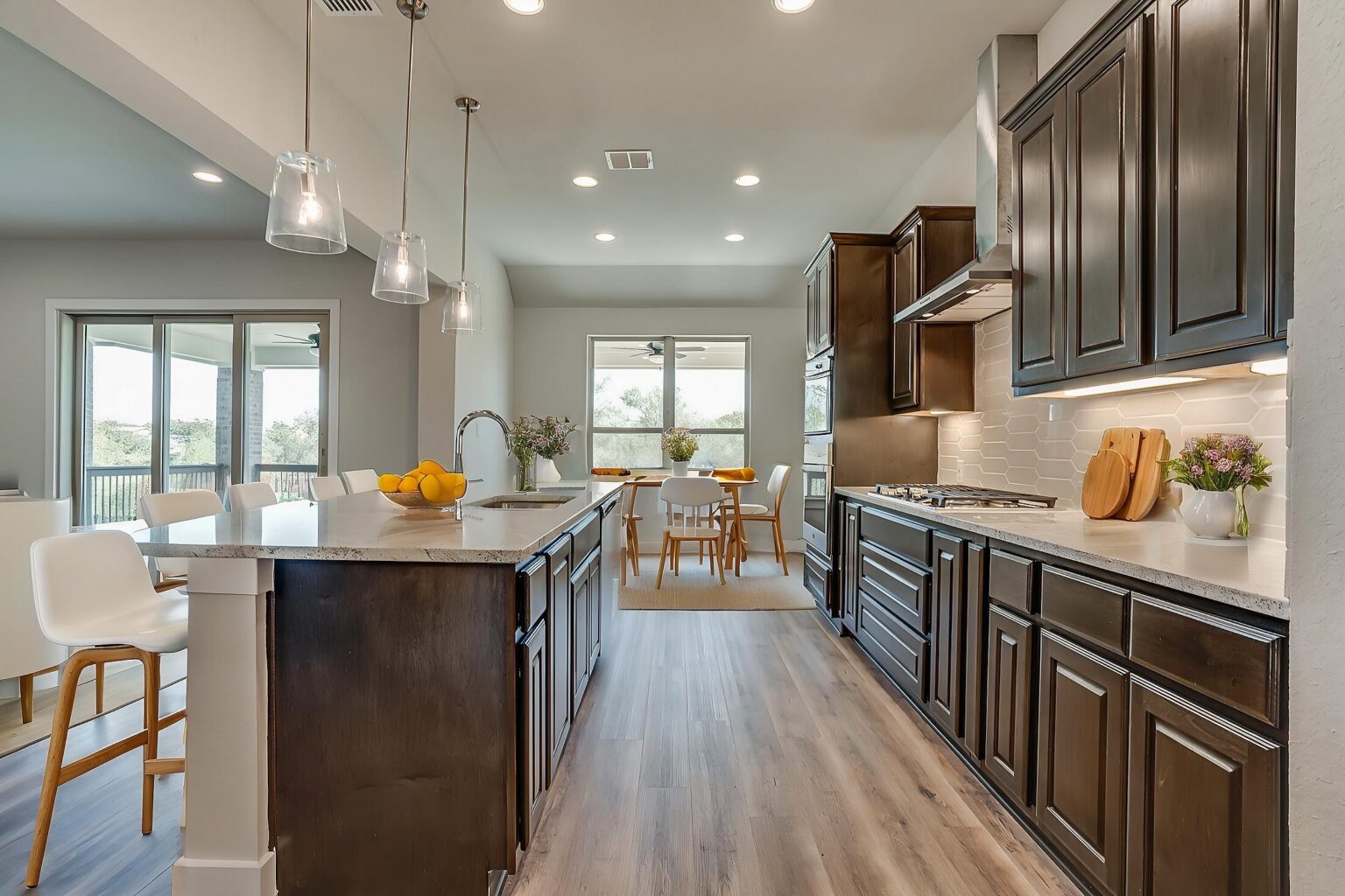The Calaveras Plan at Everly Estates showcases a refined 2,714 sq. ft. open-concept design perfectly situated on an expansive 1/2 acre homesite. Engineered for peak efficiency, the residence includes a high-performance cooling system, Low E 3 solar reflective windows, and a gas tankless water heater to minimize utility costs. The interior is defined by elegant luxury vinyl plank flooring and a wood-burning fireplace featuring a custom stone surround and mantle. A designer kitchen serves as the heart of the home, boasting J-Kraft custom shaker 42” cabinetry, premium GE® stainless steel appliances, and a specialized Kinetico drinking water system. The exterior is equally impressive, featuring a brick and stone elevation and a professional irrigation system that maintains the native drought-resistant landscaping.