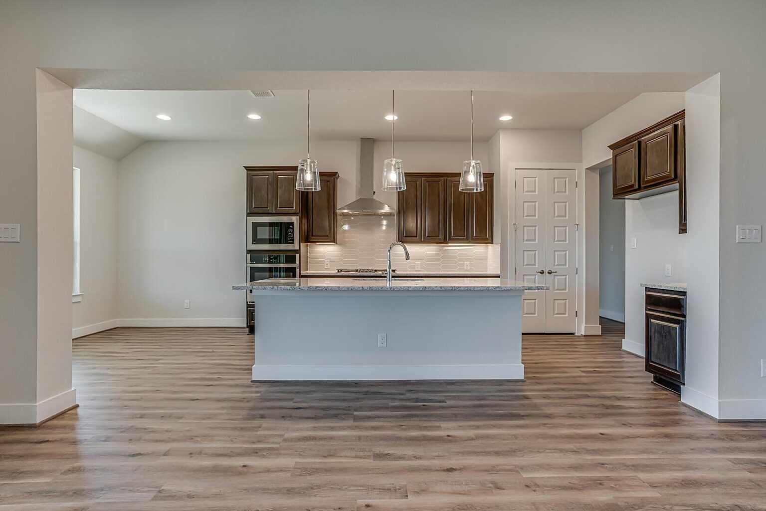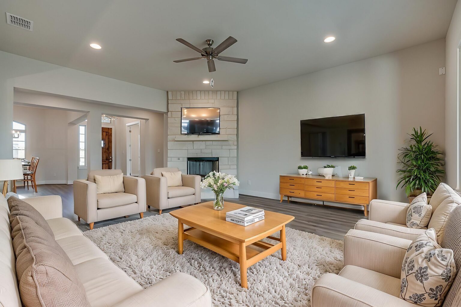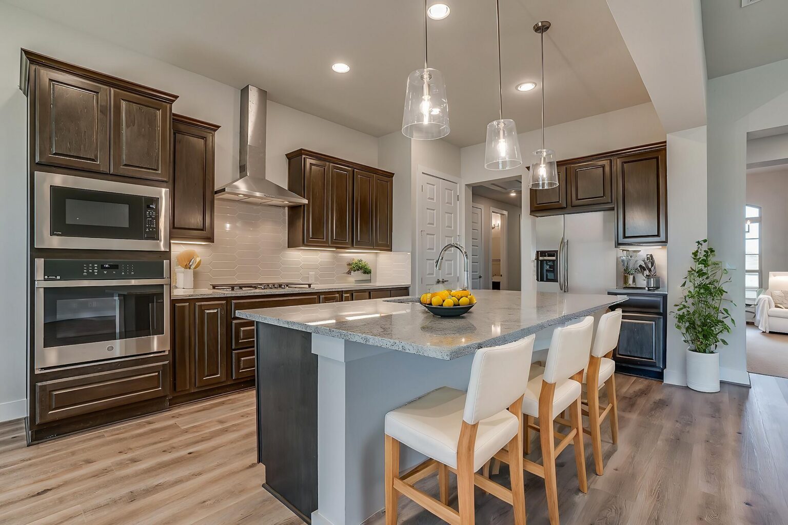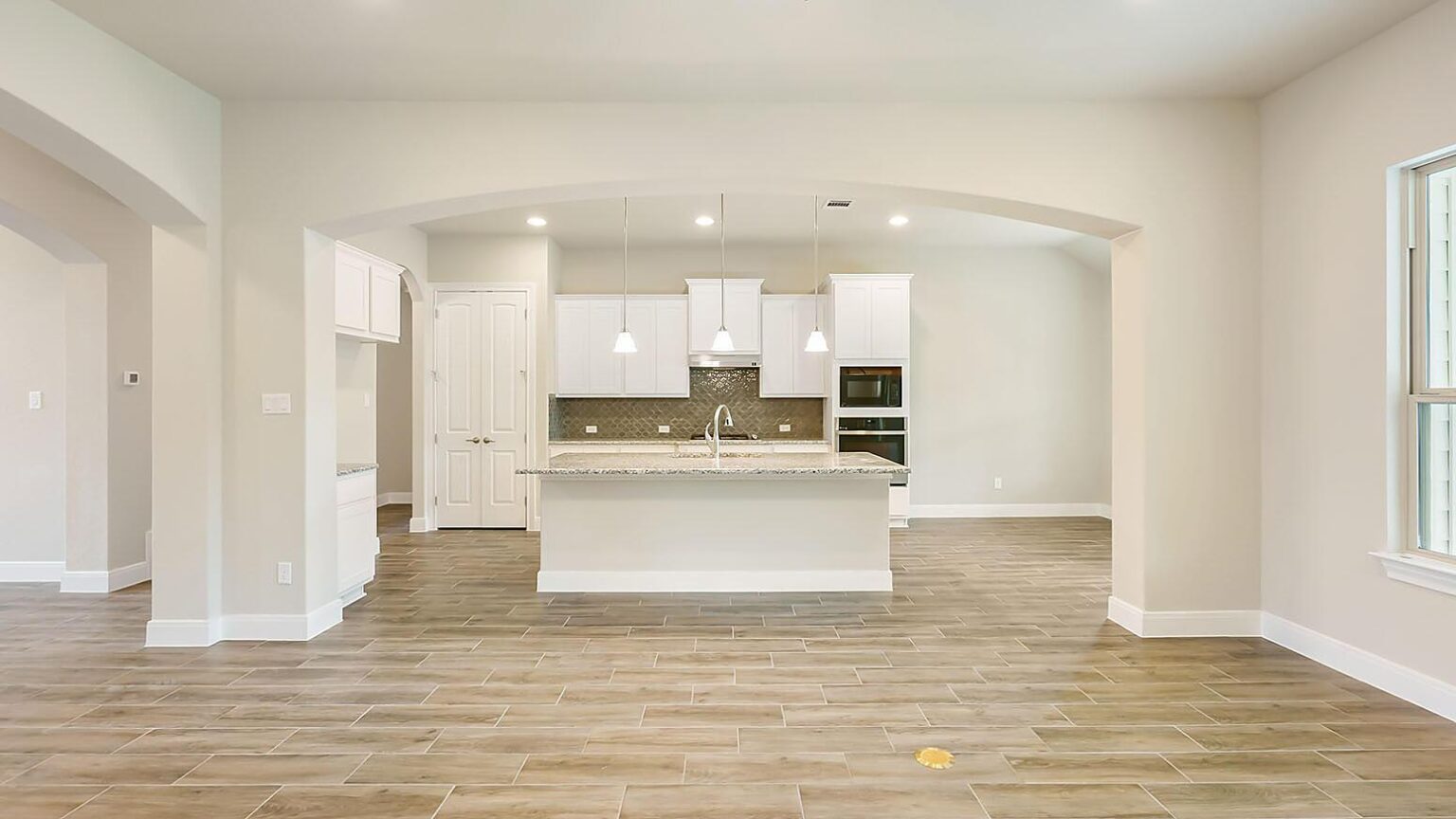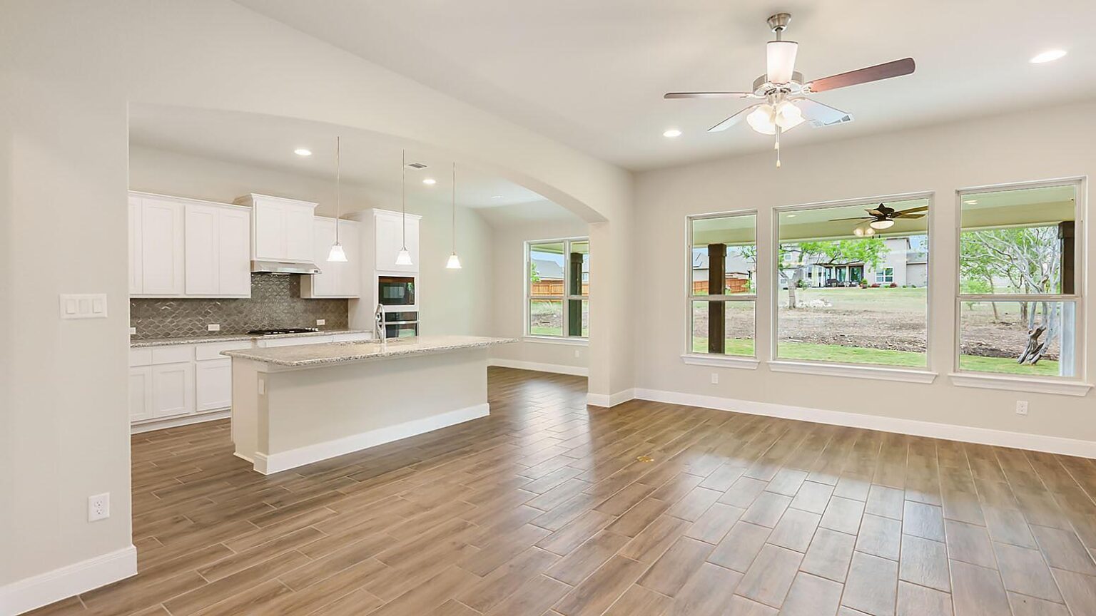 The Calaveras Plan at Everly Estates showcases a refined 2,714 sq. ft. open-concept design perfectly situated on an expansive 1/2 acre homesite. Engineered for peak efficiency, the residence includes a high-performance cooling system, Low E 3 solar reflective windows, and a gas tankless water heater to minimize utility costs. The interior is defined by elegant luxury vinyl plank flooring and a wood-burning fireplace featuring a custom stone surround and mantle. A designer kitchen serves as the heart of the home, boasting J-Kraft custom shaker 42” cabinetry, premium GE® stainless steel appliances, and a specialized Kinetico drinking water system. The exterior is equally impressive, featuring a brick and stone elevation and a professional irrigation system that maintains the native drought-resistant landscaping.