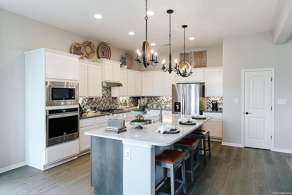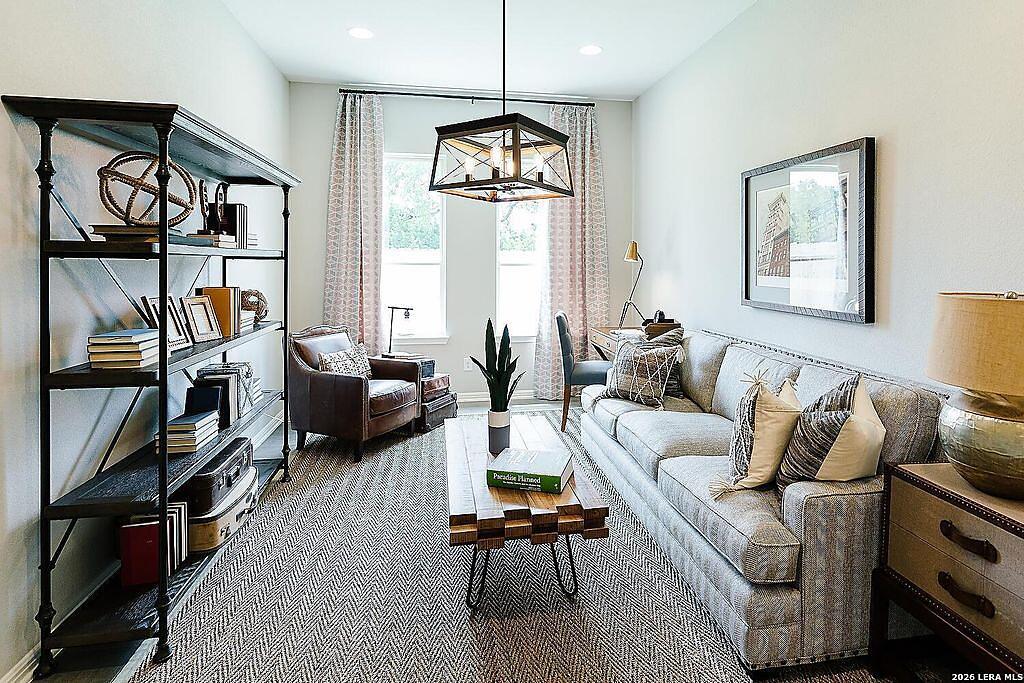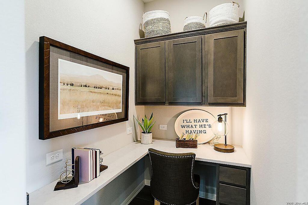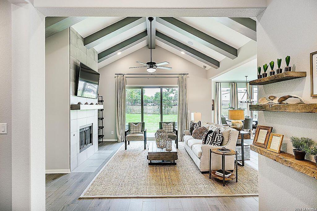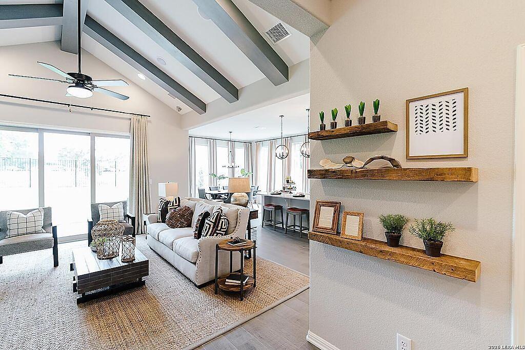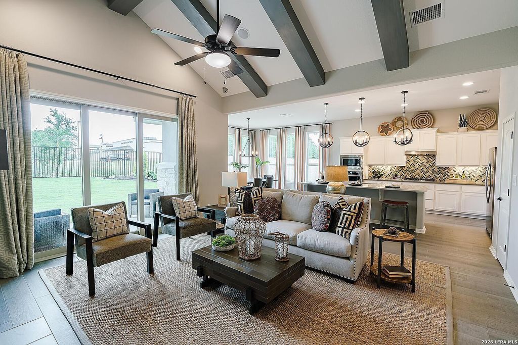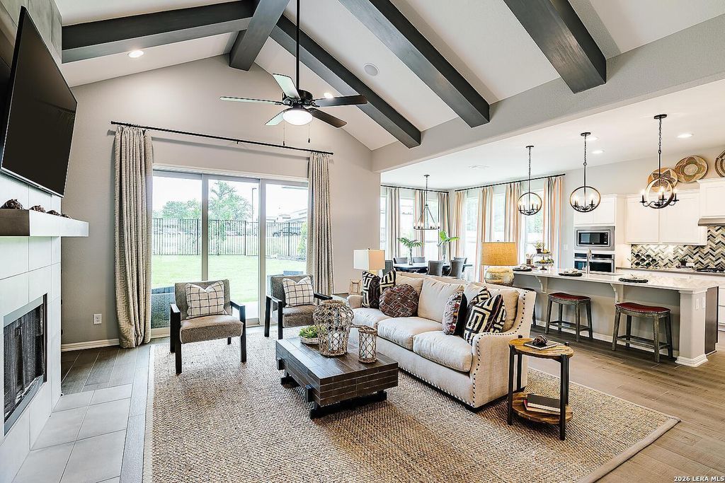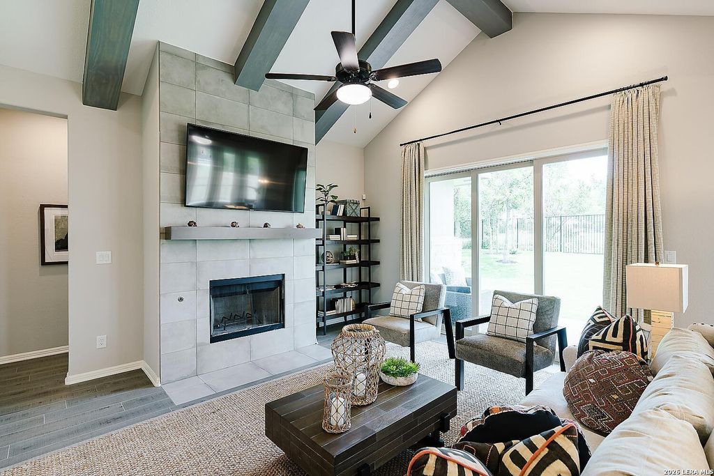 The Bowman Plan at Everly Estates offers a spacious 2,550 sq. ft. layout situated on a premier 1/2 acre lot. This energy-efficient home features a high-efficiency air conditioning system and Low E 3 solar reflective windows to ensure year-round comfort. The interior is highlighted by luxury vinyl plank flooring and a wood-burning fireplace with a custom stone surround. The gourmet kitchen is equipped with J-Kraft custom shaker cabinets and a premium GE® stainless steel appliance package. Outside, the property includes a fully sodded yard with native drought-resistant landscaping and a professional irrigation system. With its brick and stone elevation and 30-year architectural shingles, this home perfectly blends Hill Country accents with modern durability.