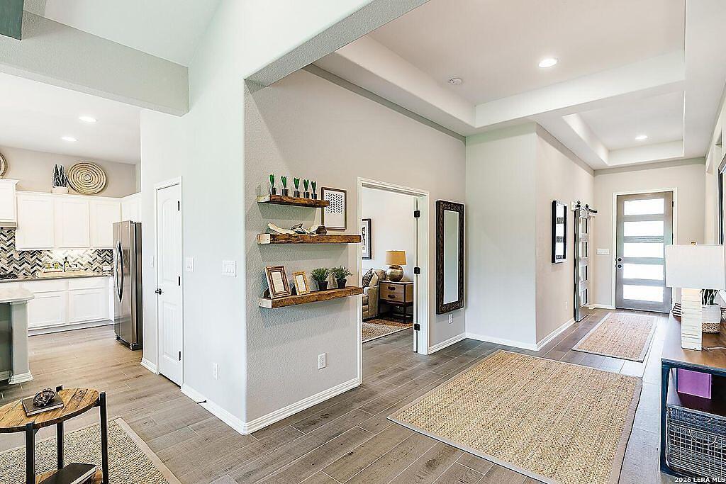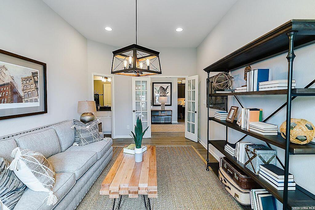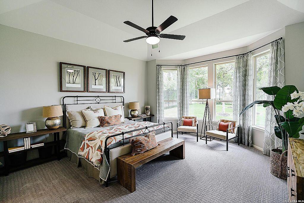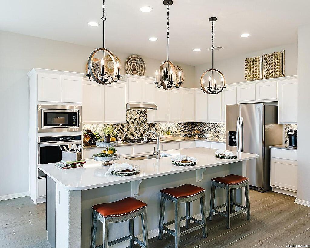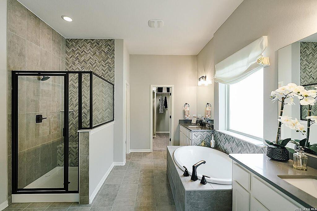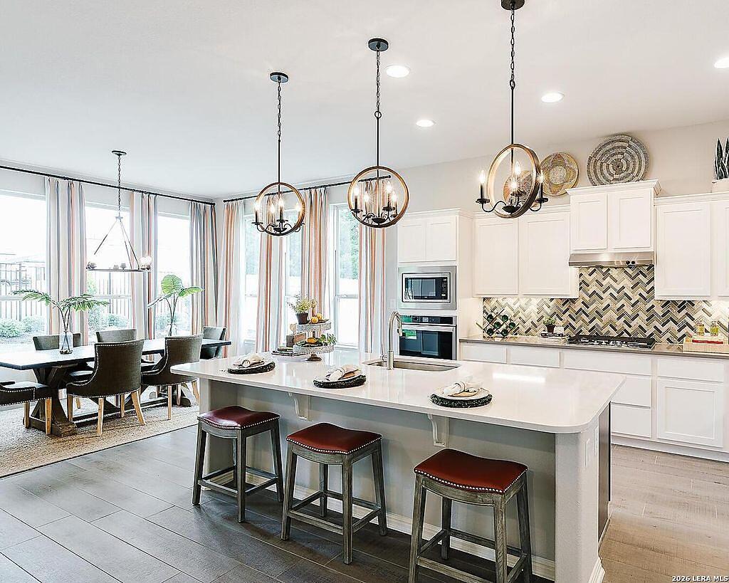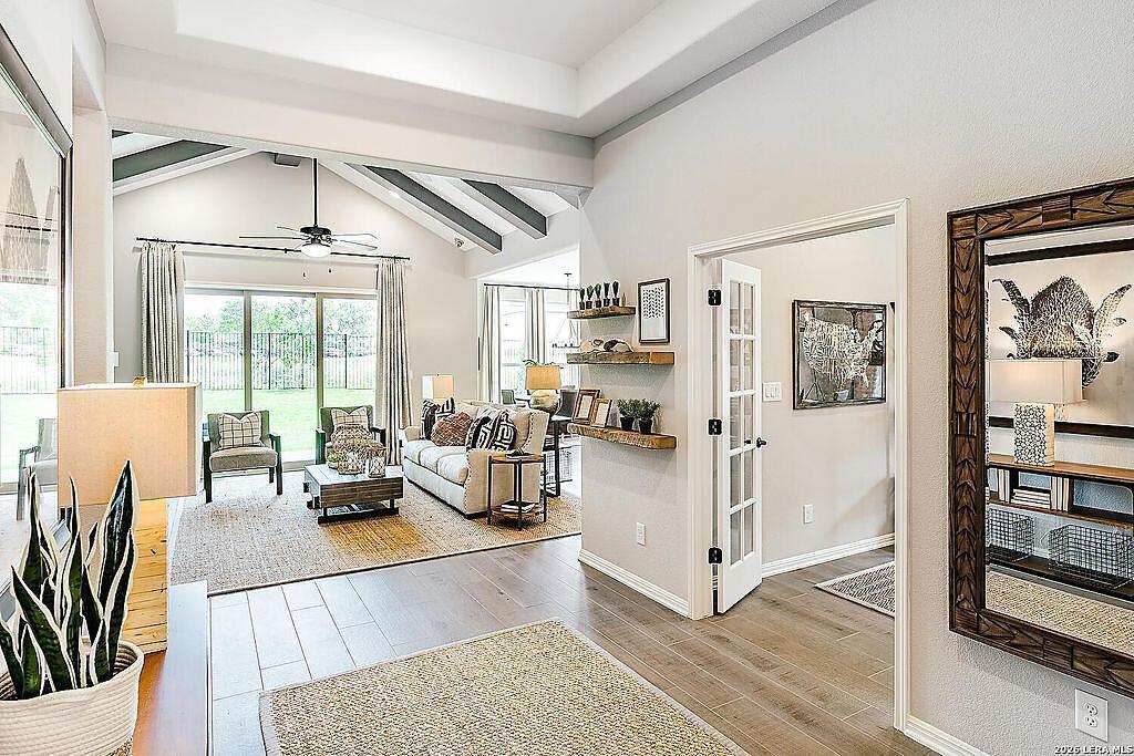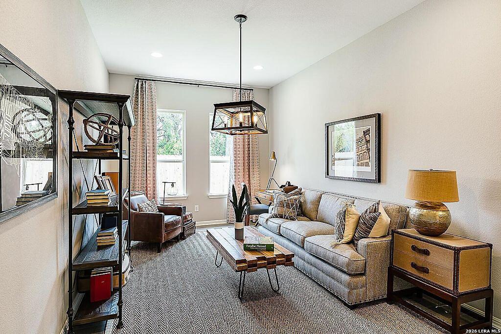 The Bowman Plan at Everly Estates offers a spacious 2,550 sq. ft. layout situated on a premier 1/2 acre lot. This energy-efficient home features a high-efficiency air conditioning system and Low E 3 solar reflective windows to ensure year-round comfort. The interior is highlighted by luxury vinyl plank flooring and a wood-burning fireplace with a custom stone surround. The gourmet kitchen is equipped with J-Kraft custom shaker cabinets and a premium GE® stainless steel appliance package. Outside, the property includes a fully sodded yard with native drought-resistant landscaping and a professional irrigation system. With its brick and stone elevation and 30-year architectural shingles, this home perfectly blends Hill Country accents with modern durability.