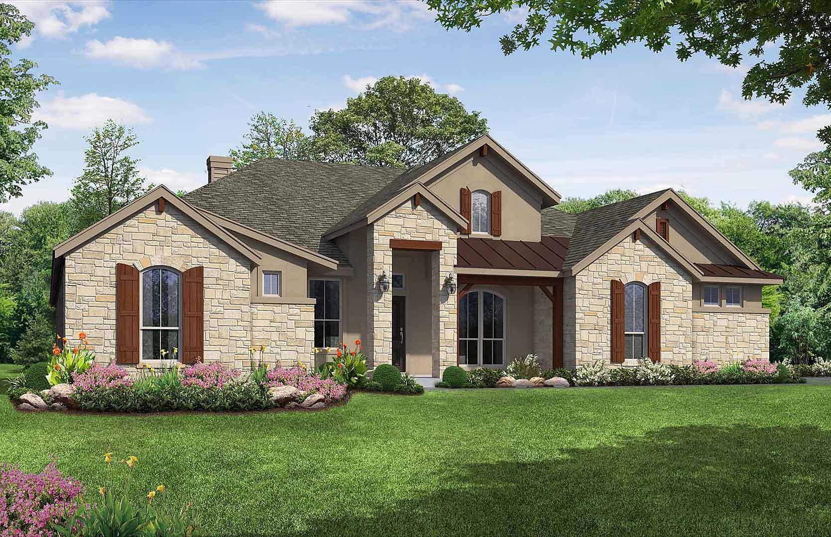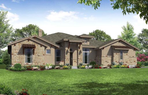 The Braunig is a 4 bedroom, 3 bath, single story home with a 2 car side entry garage. It features a spacious open concept floor plan that includes a Rotunda at the entry, formal dining room, study and playroom. A 10 foot stone fireplace in the family room is standard in this plan along with a large primary suite with walk-in shower, dual vanities, dual linen closets and spacious walk-in closet with built-in shelving. Other options available include media room, optional 5th bedroom, hobby room, and outdoor living space.